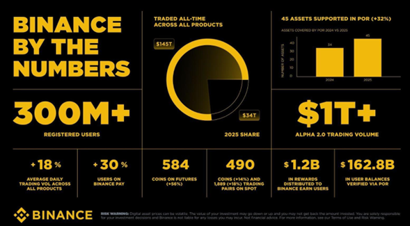 La adopción también creció. En 2025, el volumen de fiat y P2P creció un 38%; los usuarios de Binance Pay aumentaron un 30% anual, y la aceptación creció masivamente a más de 20 millones de comercios. En toda su línea de productos, Binance Earn distribuyó 1.2 mil millones de dólares en recompensas a los usuarios durante 2025.