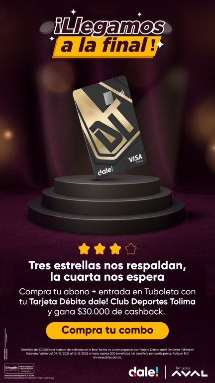 El beneficio está inspirado en la historia del Deportes Tolima: tres estrellas los respaldan y la cuarta los espera. Quienes adquieran su abono + entrada con la Tarjeta Débito dale! – Club Deportes Tolima recibirán $30.000 de cashback. Además, al realizar su compra con dale!, los usuarios disfrutarán de los beneficios habituales de sus tarjetas.