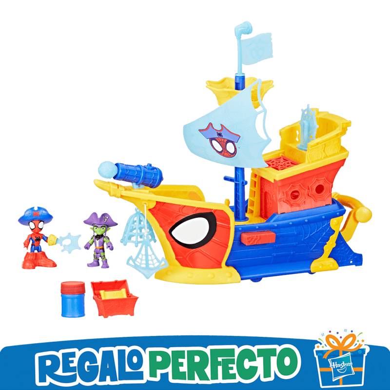 Invita a divertirse jugando en el entretenido mundo de los piratas. El barco pirata temático de Spidey es extensible y cuenta con dos figuras articuladas: Spidey y Duende Verde. Tiene un generador de burbujas real, un cañón lanzador de telarañas para derrotar a los enemigos, y ruedas onduladas que simulan el movimiento sobre olas. Es un juego que favorece la creatividad, coordinación motora, la narración de historias y la diversión sensorial con burbujas.