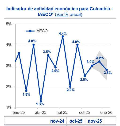 Este es un análisis del del equipo de Investigaciones Económicas y Análisis de Mercados del Banco de Bogotá § Después del crecimiento económico de 3.6% en el tercer trimestre, el Indicador de Actividad Económica para Colombia (IAECO) prevé una ralentización hasta 3.0% en el último trimestre, como consecuencia de una moderación del gasto de