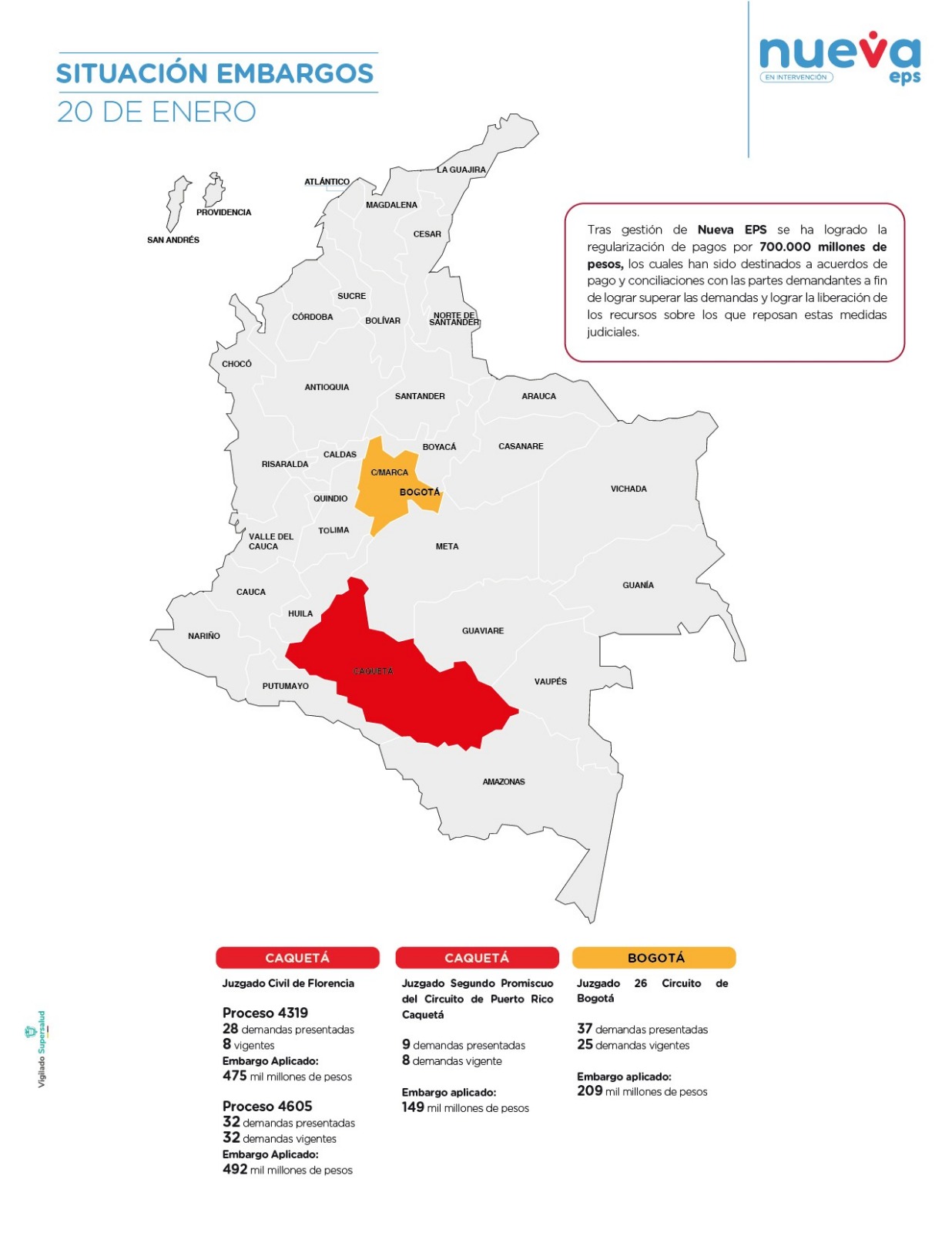 Actualmente los embargos mencionados se concentran en aproximadamente 95 IPS que presentaron las demandas en el proceso de intervención de NUEVA EPS siendo en su mayoría (80%) las principales Instituciones privadas del país. Los cuatro Juzgados que concentran el mayor número de medidas de embargo son el Juzgado Primero Civil del Circuito de Florencia – Caquetá, Juzgado Segundo Civil del Circuito de Florencia, Juzgado Segundo Promiscuo Municipal del Circuito de Puerto Rico – Caquetá y Juzgado 26 Civil del Circuito de Bogotá.