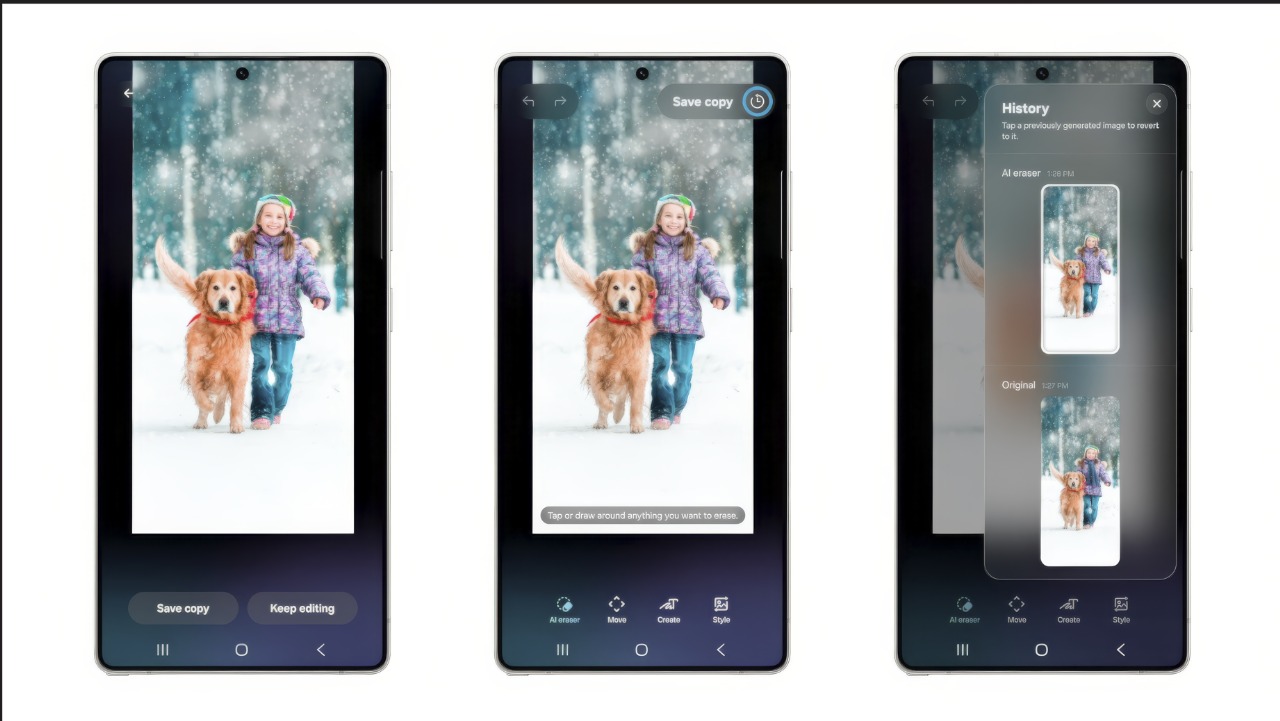 One UI 8.5 introduce nuevas formas de generar, editar y compartir contenido desde el teléfono, con procesos más simples y fluidos. La versión actualizada de Photo Assist[1] permite crear imágenes de manera continua y sin interrupciones. Los usuarios pueden editar y ajustar sus fotos sin necesidad de guardar cada cambio, y al finalizar, revisar todas las versiones en un historial para elegir sus favoritas.